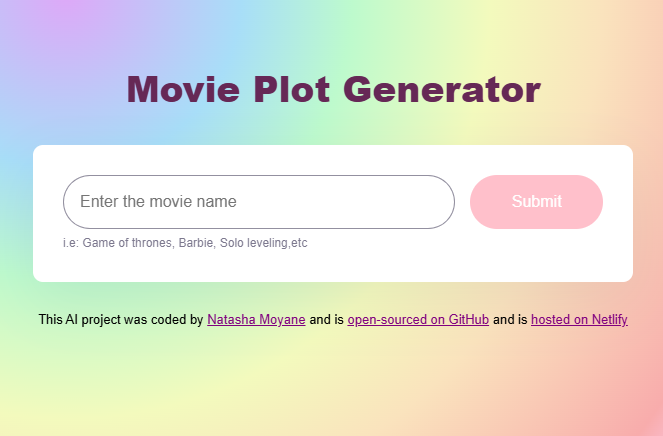 An AI-powered movie plot generator for dvsn, developed with HTML, CSS, and JavaScript. With a simple click, users can generate unique and creative storylines, all within a clean and interactive interface. This project showcases the blend of design and functionality to deliver fun, engaging user experiences.